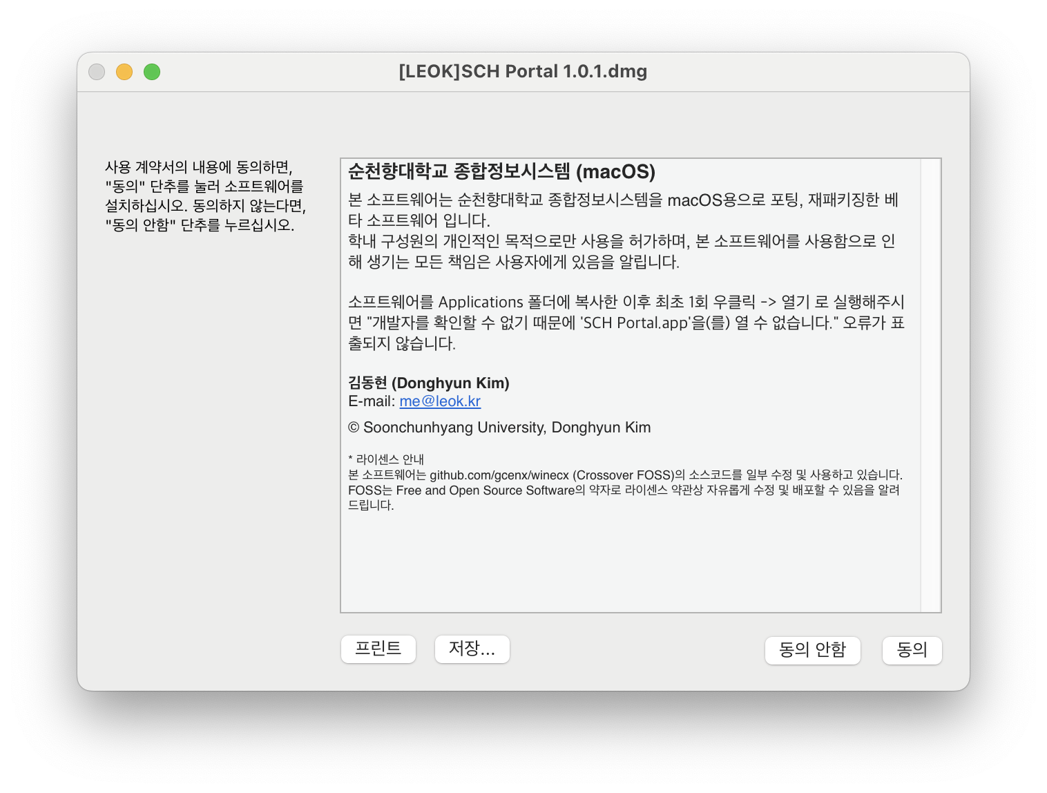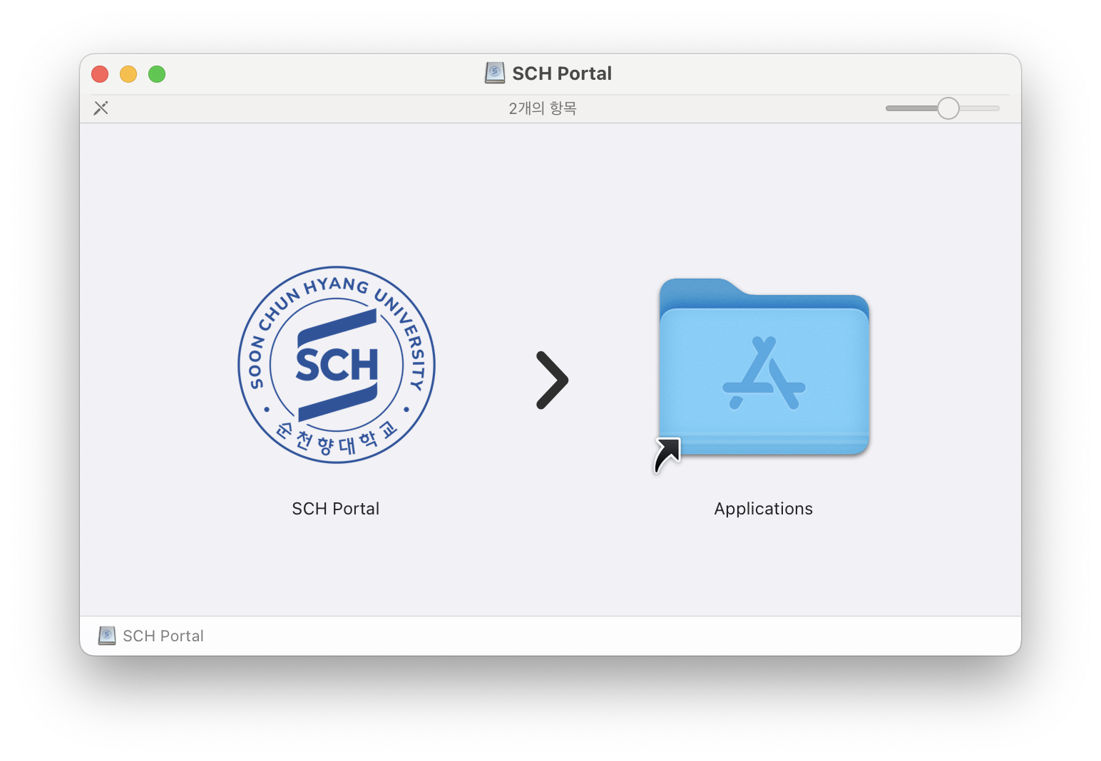 | .dmg 파일 실행 후 약관 동의 | SCH Portal → Applications 폴더로 드래그 |