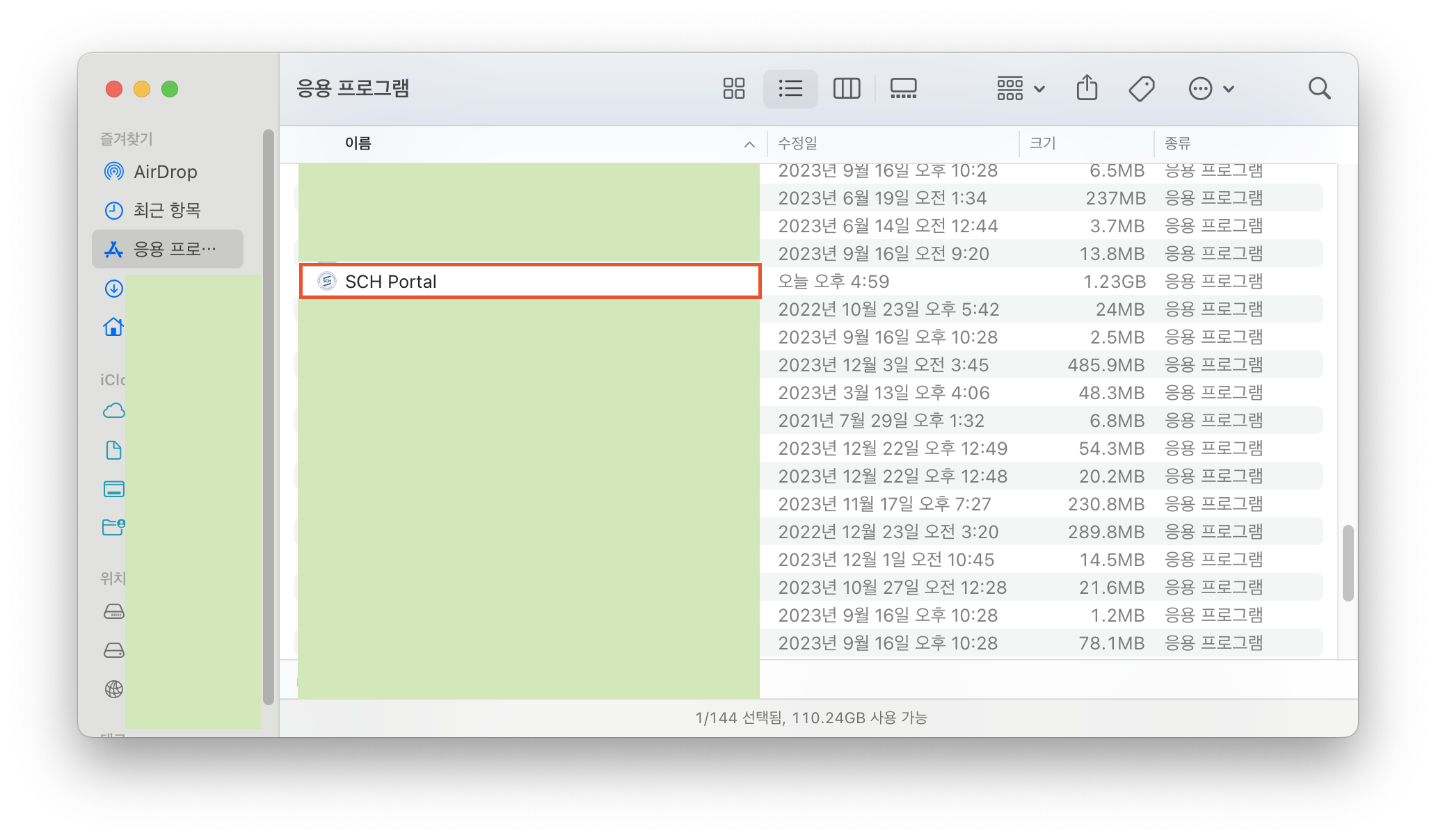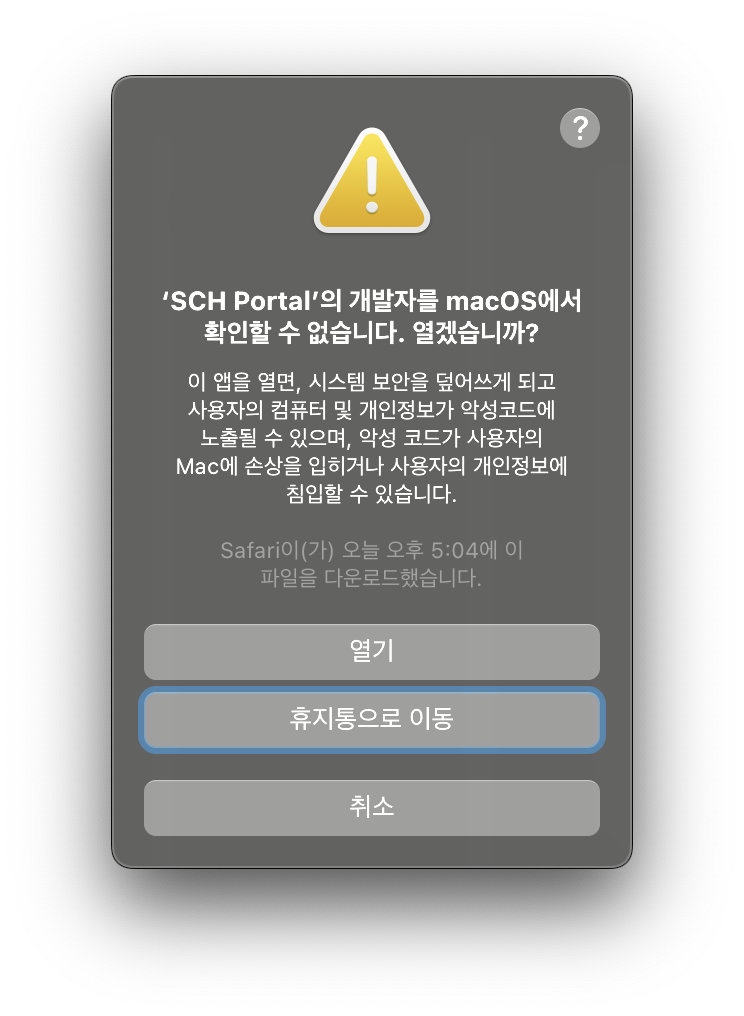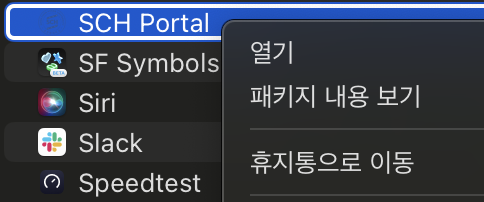 | Finder → 응용프로그램 → SCH Portal 우클릭 후 열기 |